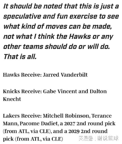 美媒就策划一组三方交易,湖人或得到硬汉米切尔-罗宾逊,前快船侧翼工兵特伦斯-曼恩当添头,此外湖人还收获帕克姆-达迪耶以及两个次轮选秀权。尼克斯作为主要合作对象,会得到盖布-文森特和道尔顿-克内克特,青年军老鹰则是第三方,收下贾里德-范德比尔特。
